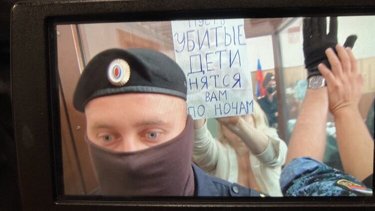 Перед тем, как уйти из зала суда, Овсянникова успела развернуть в клетке плакат с надписью "Пусть убитые дети снятся вам по ночам".
