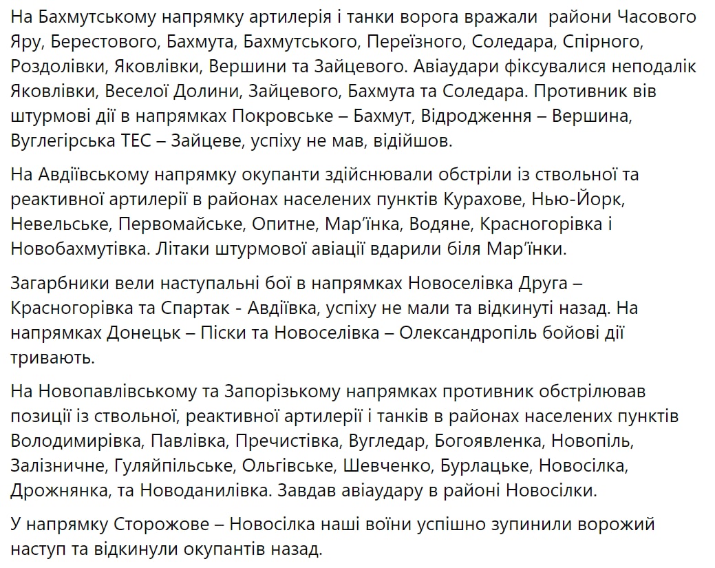 На Бахмутском направлении наступательными и штурмовыми действиями россияне пытались продвинуться у Яковлевки, Бахмута, Вершины и Зайцево, успеха не имели, кое-где продолжаются боевые действия.