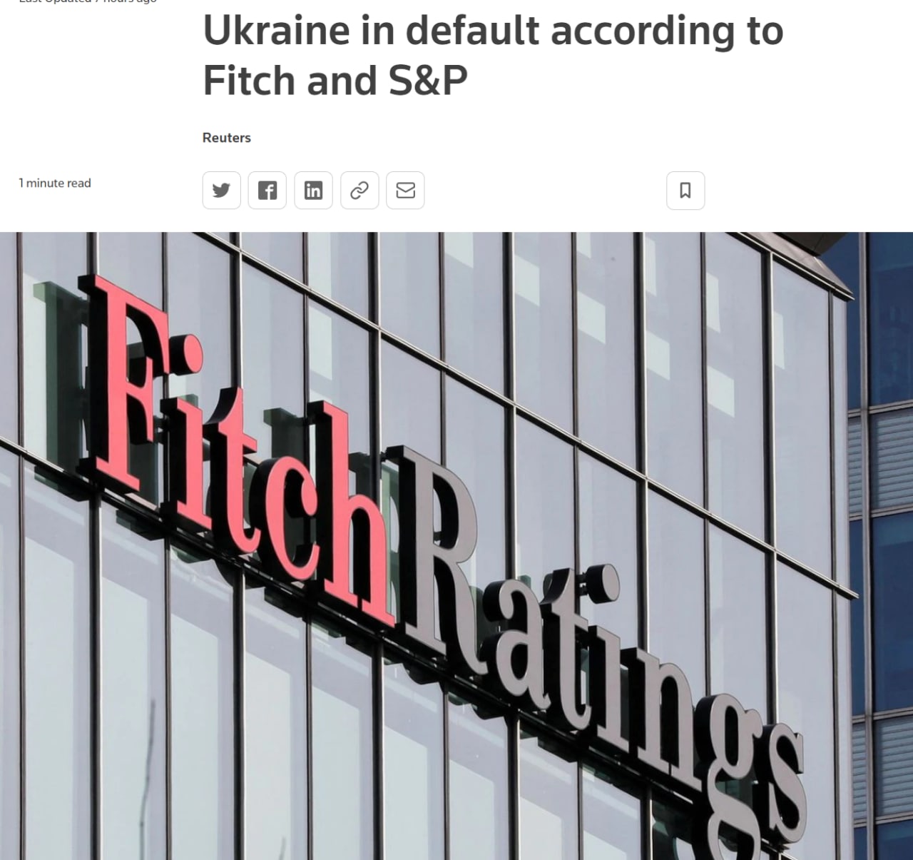 09:04 Украина объявила дефолт, считают глобальные рейтинговые агентства S&P и Fitch.