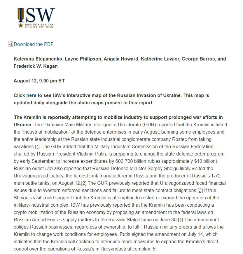 Как отмечает американские аналитики, Главное управление военной разведки Украины (ГУР) сообщило, что Кремль инициировал "производственную мобилизацию" оборонных предприятий в начале августа, запретив некоторым сотрудникам и всему руководству российского государственного промышленного конгломерата Ростех брать отпуска. В ГУР добавили, что Военно-промышленная комиссия РФ под председательством президента РФ Владимира Путина готовится к началу сентября изменить программу гособоронзаказа, чтобы увеличить расходы на 600-700 млрд рублей (примерно на 10 млрд долларов).