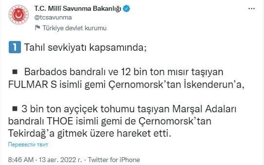 10:53 Еще два судна с украинской сельскохозяйственной продукцией вышло из порта Черноморск. Об этом сообщает у себя в твиттере Министерство обороны Турции.