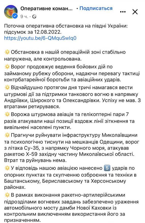 11:10 Оперативное командование "Юг" сообщает, что ВСУ нанесли удар по автомобильному мосту на дамбе в Новой Каховке.