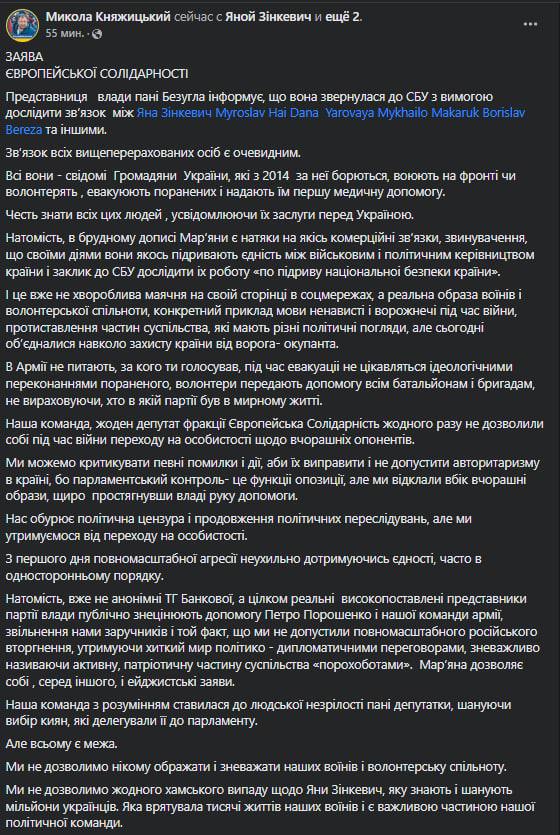12:14 Депутат от "Слуги народа" Марьяна Безуглая отправила запрос в СБУ с требованием провести расследование по факту существования некой сети волонтёров и политиков (преимущественно из лагеря Порошенко), которые, по мнению Безуглой, во время войны согласовано расшатывают ситуацию в Украине, проводя линию на раскол между политическим руководством Страны и военным командованием.