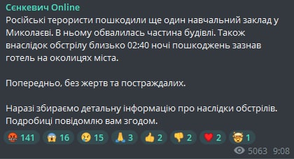 09:16 В Николаеве во время ночных обстрелов повреждено очередное учебное заведение. Часть здания обрушилась, заявил мэр города Александр Сенкевич.