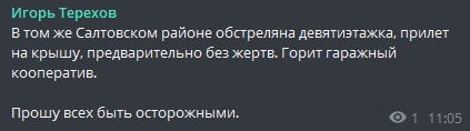 11:10 В Салтовском районе Харькова снаряд попал в крышу девятиэтажки, горит гаражный кооператив, сообщил мэр города Игорь Терехов.