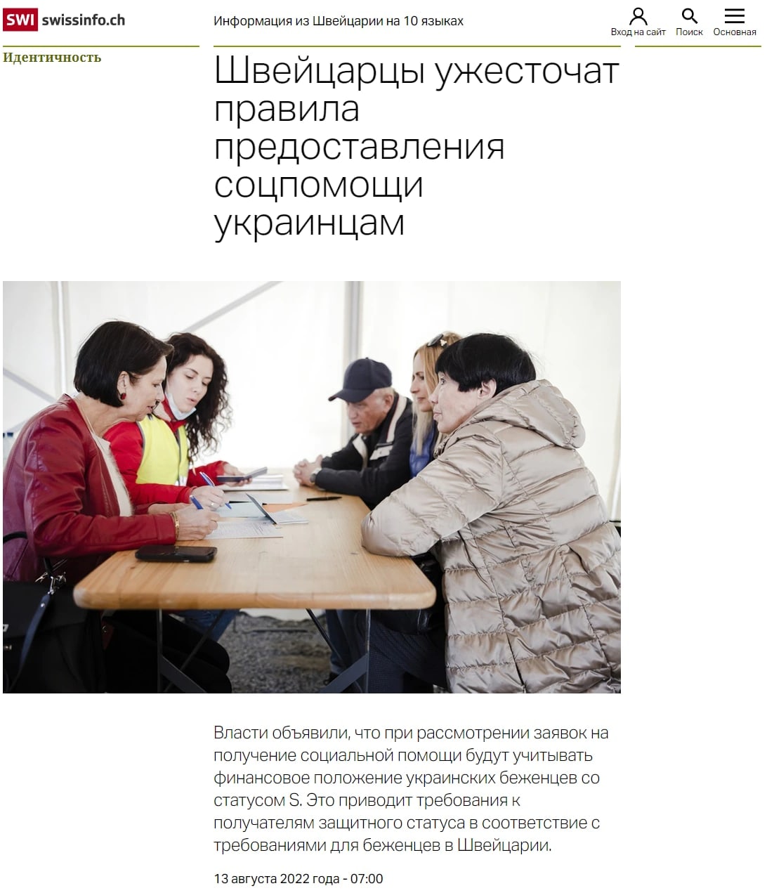 11:30 Власти Швейцария при оформлении выплат для беженцев будет учитываться финансовое положение украинцев, пишет SwissInfo.