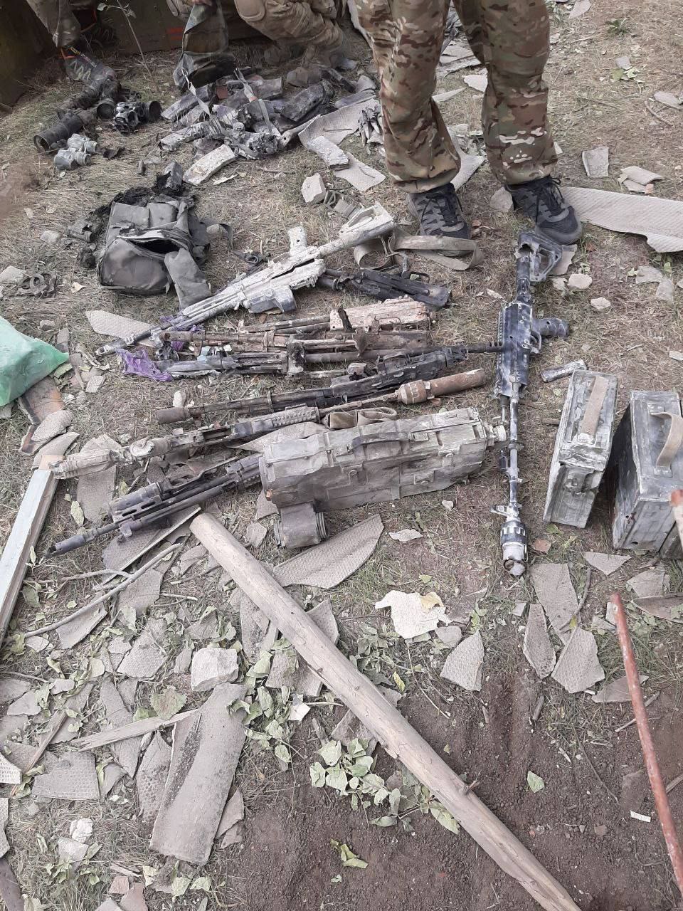 На фото сгоревшее оружие и вещи "вагнеровцев". Судя по фото фасада, здание базы уничтожено до основания.