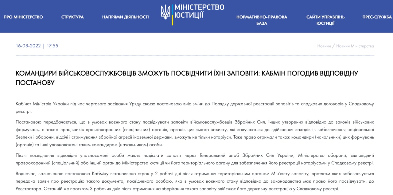 Кабмин разрешил командирам заверять завещания солдат в условиях военного положения. Ранее таким правом обладали исключительно нотариусы.