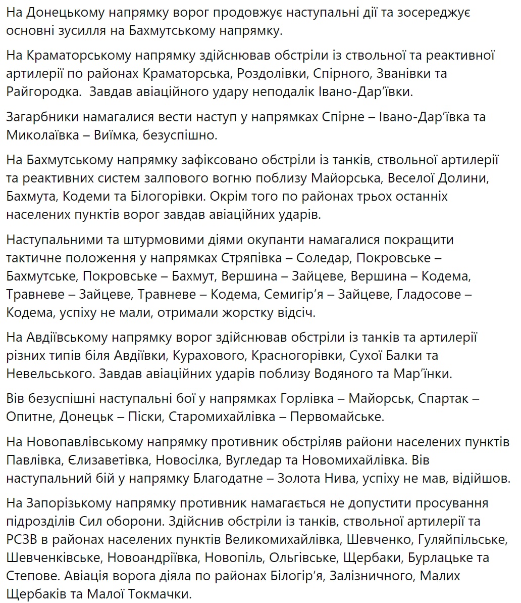 2. Под Северском и Бахмутом россияне пытались вести наступление в направлениях Спорное – Ивано-Дарьевка и Николаевка – Выемка, безуспешно.
