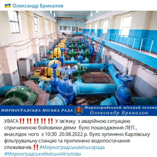 "В связи с аварийной ситуацией, вызванной боевыми действиями, было повреждение ЛЭП, вследствие чего с 10:30 20.08.2022 года была остановлена Карловская фильтровальная станция и прекращено водоснабжение потребителей", - написал чиновник.