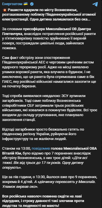 Сегодняшний обстрел Вознесенска (Николаевская область) "Энергоатом" называет "очередным циничным актом ядерного терроризма России".