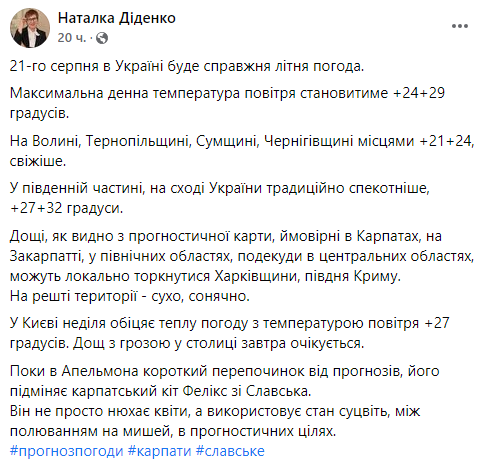 Синоптик Наталья Диденко сообщила, что 21 августа погода в Украине будет по-настоящему летней. Максимальная дневная температура будет составлять +24...+29 градусов.
