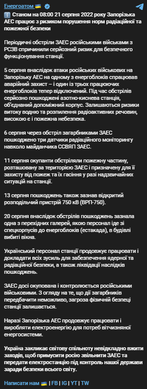 "ЗАЭС до сих пор оккупирована и контролируется российскими военными. Учитывая, что действия захватчиков предусмотреть невозможно, угроза физической безопасности станции остается. В настоящее время Запорожская АЭС продолжает работать и производить электроэнергию для нужд отечественной энергосистемы. Украина призывает мировое сообщество безотлагательно принять меры, чтобы заставить Россию освободить ЗАЭС и передать электростанцию ​​под контроль нашего государства ради безопасности всего мира", - написали в "Энергоатоме".