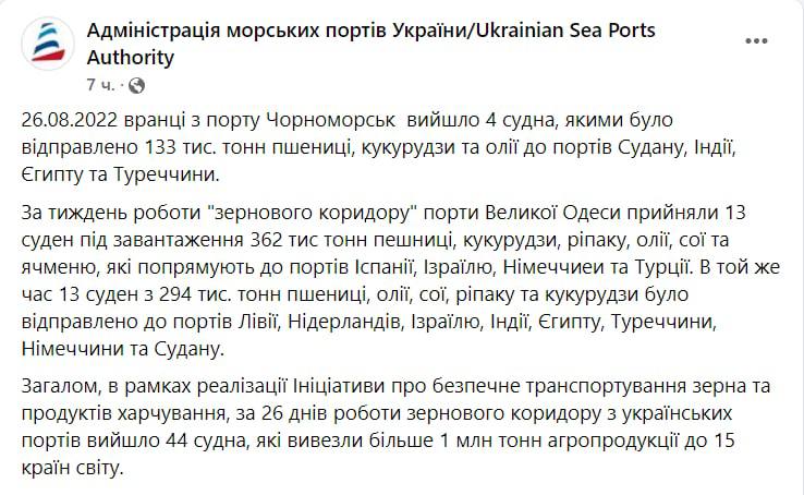 11:44 За 26 дней работы "зернового коридора" из украинских портов вышли 44 судна, которые вывезли более 1 миллиона тонн агропродукции в 15 стран мира, сообщает Администрация морских портов Украины.