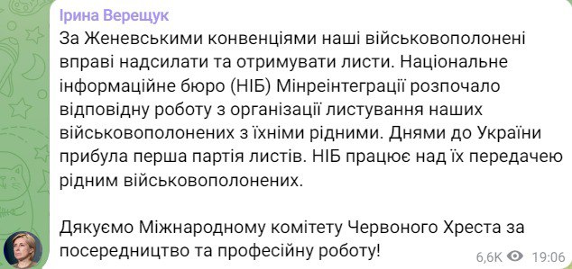 По ее словам, организацией переписки украинских военнопленных с их семьями занимается Национальное информационное бюро Минреинтеграции. С его помощью и получена первая партия писем.