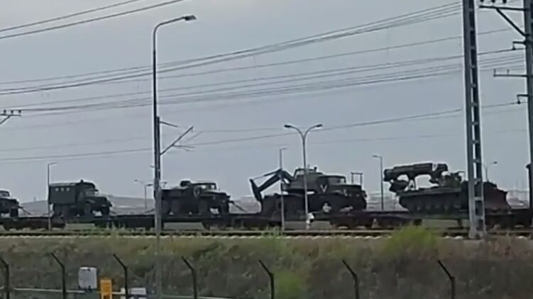 Россияне продолжают перебрасывать военную технику в Крым. Состав заметили на ж/д станции Тамань. Видео