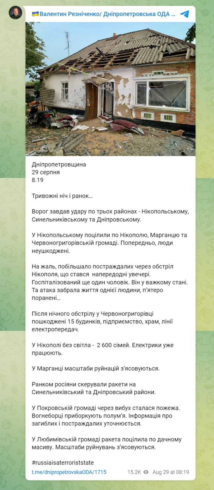 От обстрелов со стороны россиян ночью и утром 29 августа пострадали Днепровский, Никопольский и Синельниковский районы Днепропетровской области.