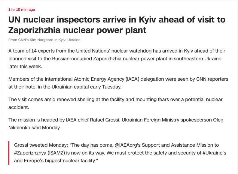 По данным СМИ, миссия МАГАТЭ на Запорожскую АЭС продлится с 31 августа по 3 сентября, а гендиректор МАГАТЭ намерен оставить несколько человек на Запорожской АЭС на постоянной основе.