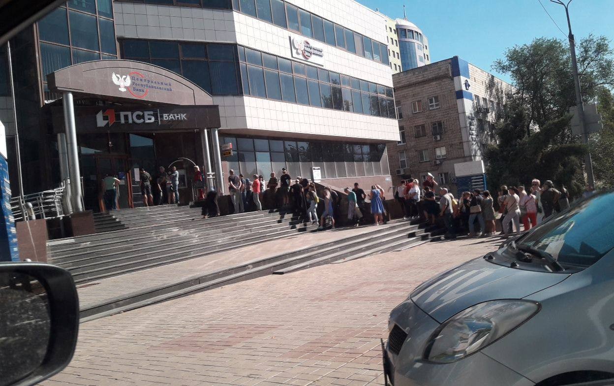 09:58 На фото - очередь за справкой в "центральный республиканский банк ДНР" для получения 10 тысяч рублей (6,1 тыс.грн) на подготовку ребенка к учебному году.