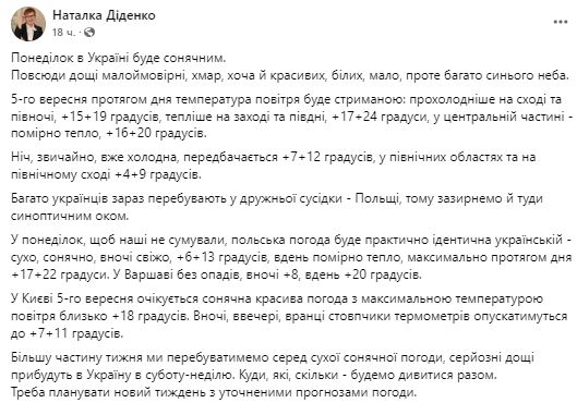 В понедельник, 5 сентября, в Украине ожидается сухая и солнечная погода.