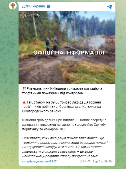 Во вторник, 6 сентября, по состоянию на 09:00, спасатели продолжают ликвидировать горение торфяников вблизи сел Сосновка и Катюжанка Вышгородского района Киевской области.