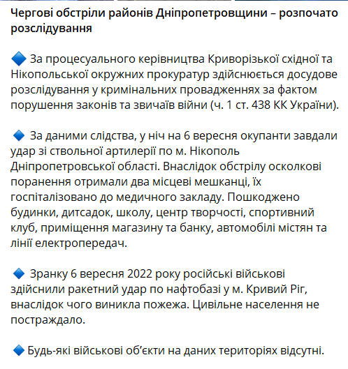 Офис генпрокурора публикует фото последствий обстрела нефтебазы в Кривом Роге 6 сентября. Начато уголовное расследование в рамках уголовного дела по факту нарушения законов и обычаев войны.