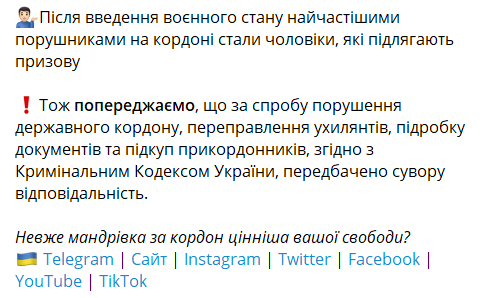 В ведомстве предупреждают, что за попытку нарушения государственной границы, переправку уклонистов, подделку документов и подкуп пограничников, согласно Уголовному кодексу Украины, предусмотрена строгая ответственность, а именно: