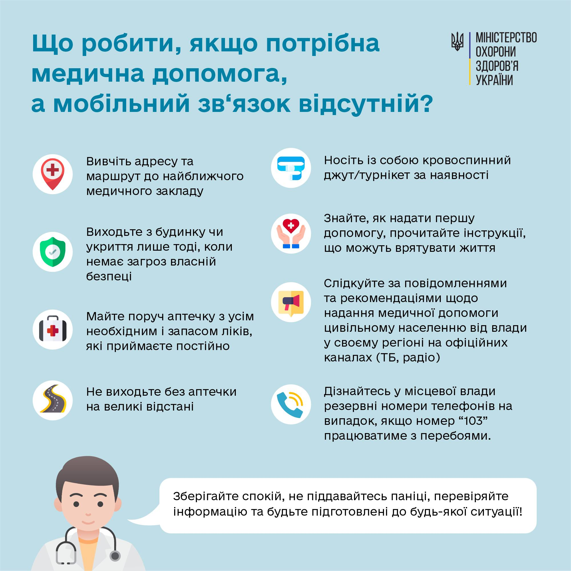 На фоне войны в Украине Министерство здравоохранения в своем Facebook рассказывает, что делать, если нужна медицинская помощь, а мобильная связь отсутствует:
