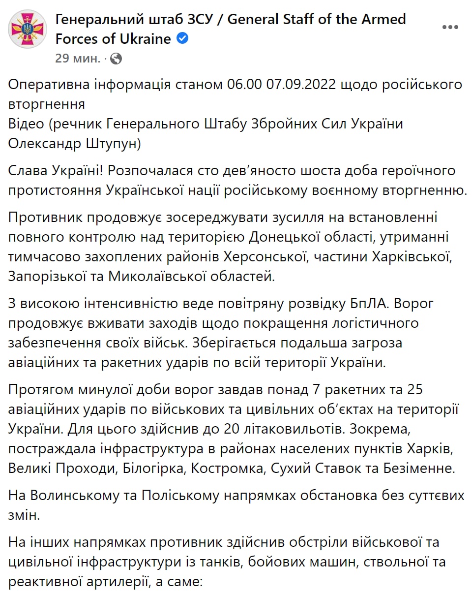 1. Противник за вчера нанес по Украине семь ракетных ударов и 25 авиаударов.