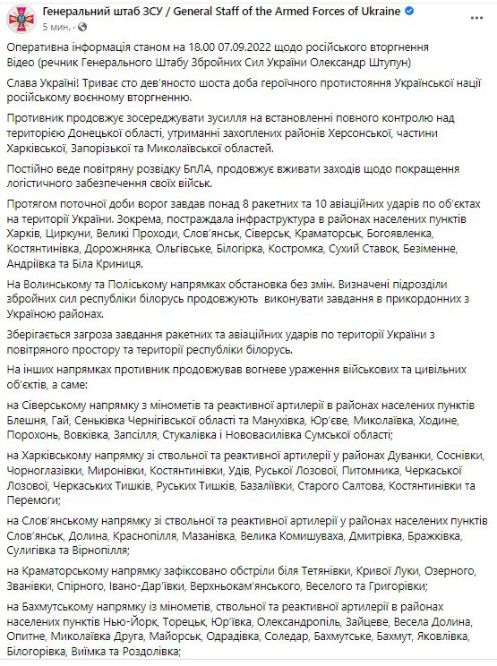 В среду, 7 сентября, в Украине идет уже 196-й день войны с Россией.