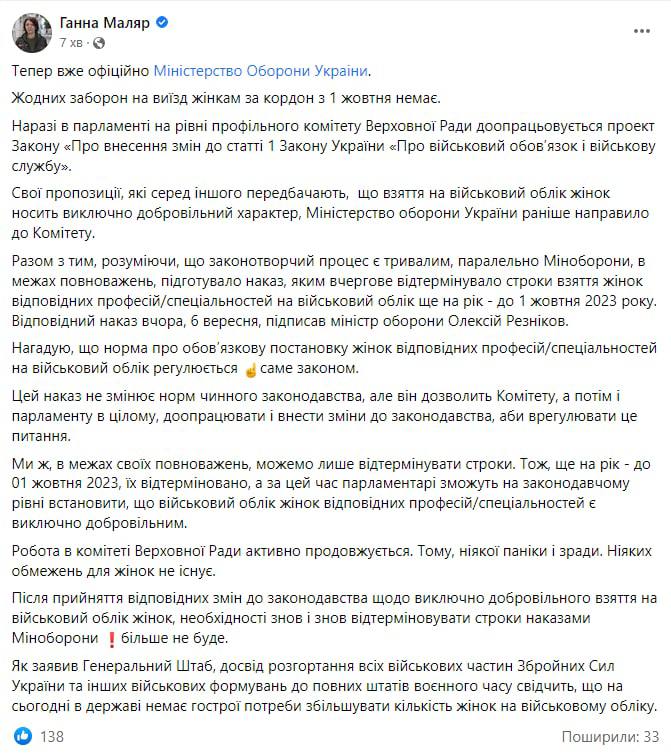 Министерство обороны Украины своим приказом перенесло срок начала обязательной постановки женщин на воинский учёт с 1 октября 2022 года на 1 октября 2023 года. Соответственно, никаких запретов для выезда женщин за границу с 1 октября нет.
