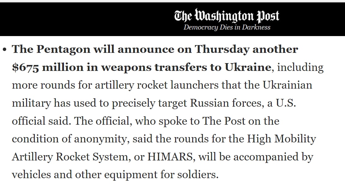 08.25 Сегодня Пентагон объявит о новом пакете военных поставок Украине на 675 миллионов долларов.