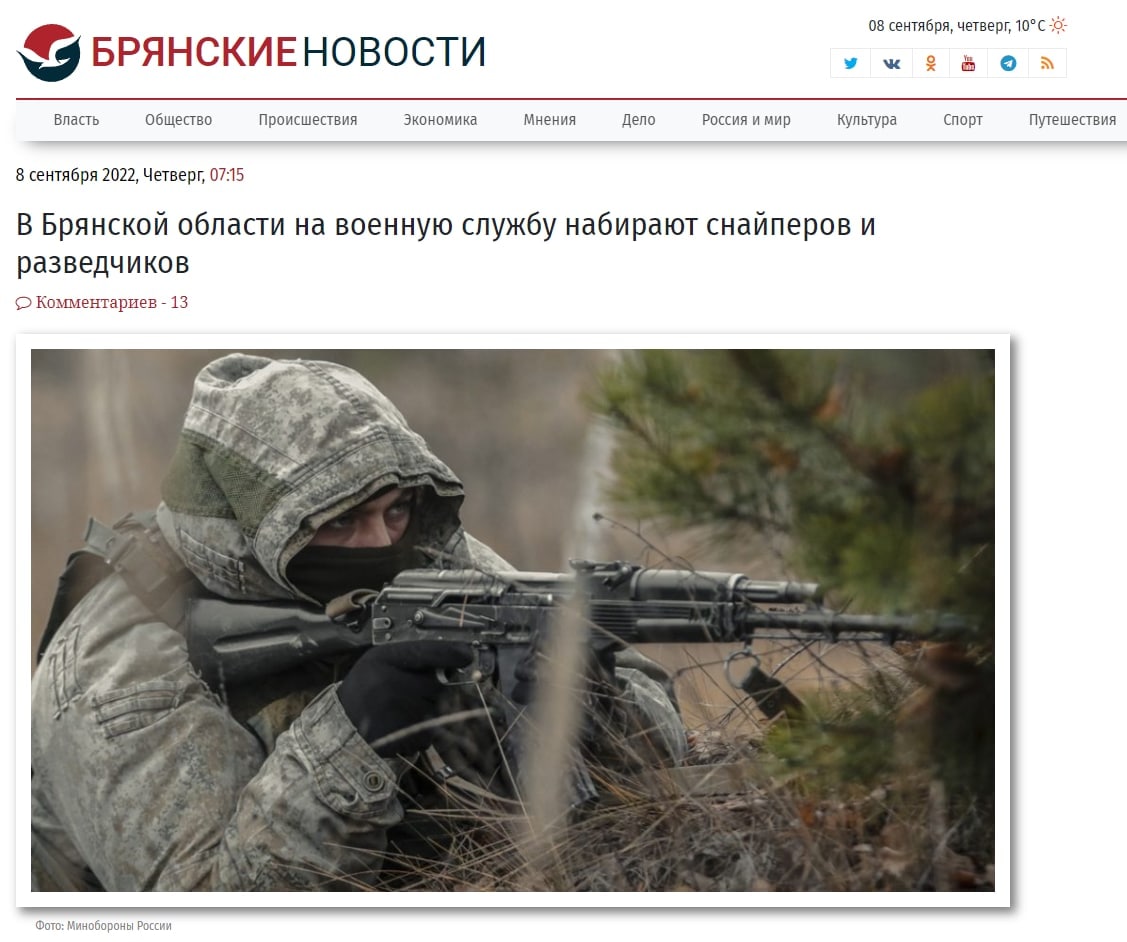 10.57 В Брянской области России (граничит с Черниговской и Сумской областями) на сайтах по поиску набирают снайперов и разведчиков, сообщают местные СМИ.