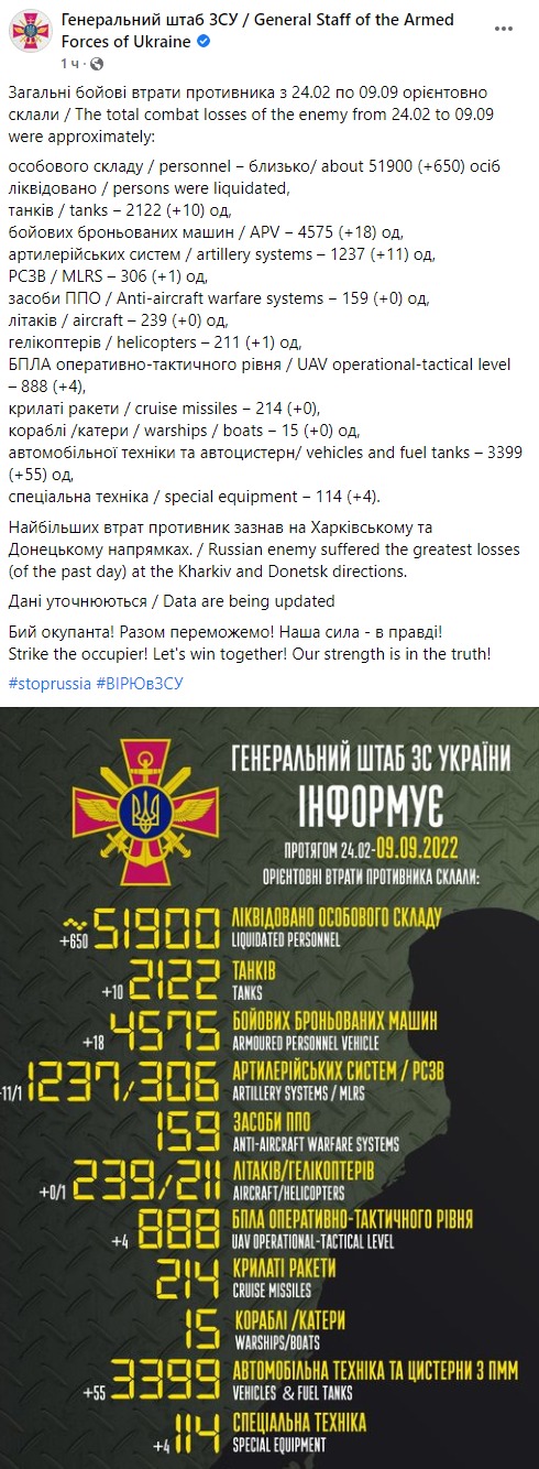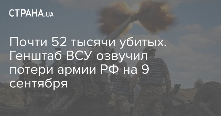 По состоянию на утро пятницы, 9 сентября, с 24 февраля армия РФ потеряла уже около 51 900 (+650 человек за сутки) военных убитыми.