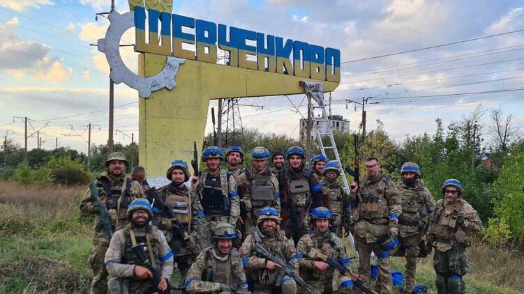 Подтверждается контроль ВСУ над Шевченково в Харьковской области. В сети появились фотографии, демонстрирующие, что стелу на въезде в поселок уже перекрасили в цвета украинского флага и с ней сфотографировались украинские военные.