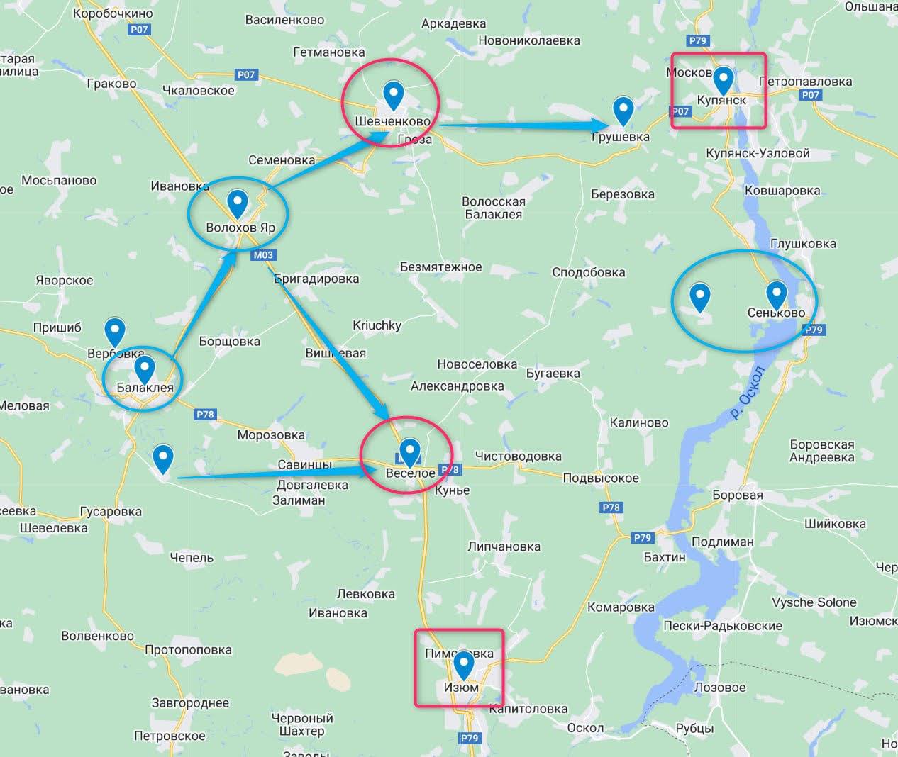 Под контролем РФ остаются дороги с востока, которые идут в Изюм южнее Оскольского водохранилища. Наверняка ВСУ попытаются перерезать и их. По крайней мере, именно в этом направлении сейчас и продвигаются украинские войска.