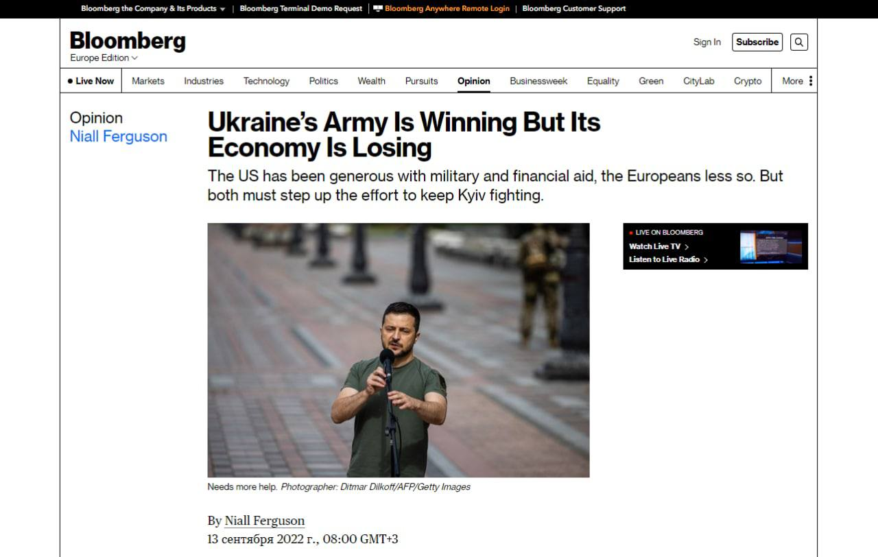 Армия Украины побеждает, но ее экономика проигрывает, пишет известный британский историк и публицист Нил Фергюсон в колонке для Bloomberg.