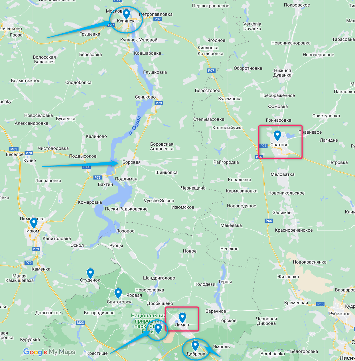Новая линия фронта вырисовывается примерно по реке Оскол восточнее Изюма.