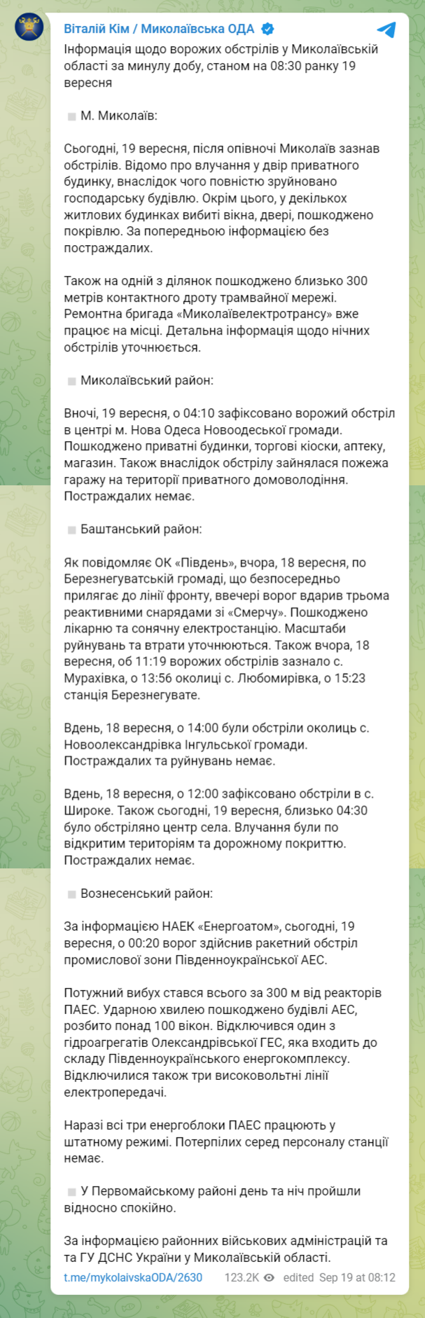 Глава Николаевской ОВА Виталий Ким рассказал об обстрелах области в течение последних суток. По его данным, войска РФ ударили по областному центру, а также Новой Одессе, Березнеговатской громаде и Южноукраинской АЭС.