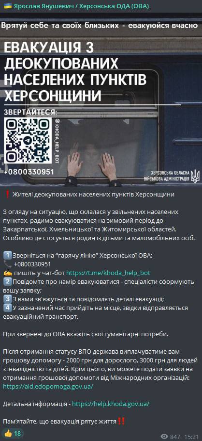 "Учитывая ситуацию, сложившуюся в освобожденных населенных пунктах, советуем эвакуироваться на зимний период в Закарпатскую, Хмельницкую и Житомирскую области. Особенно это касается семей с детьми и маломобильными лицами" - написал он.