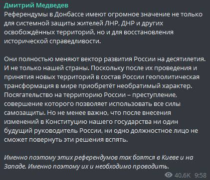 Замглавы Совбеза РФ Дмитрий Медведев пишет, что "посягательство на территорию России (которой в Москве будут считать аннексированные украинские земли - Ред.) – преступление, совершение которого позволяет использовать все силы самозащиты".