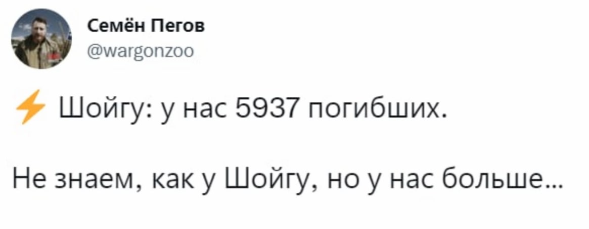 10:02 Российский военкор Семен Пегов отреагировал на заявление Шойгу о том, что РФ потеряла за 7 месяцев войны 6 тысяч человек.