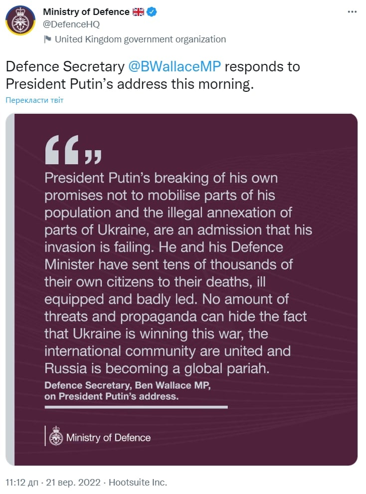 10:25 Советник ОП Михаил Подоляк отреагировал на заявление Путина о частичной мобилизации.