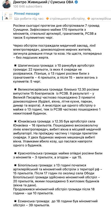 РФ нанесла почти 200 ударов по Сумской области из всех видов орудий. Разрушены дома и больница. Фото