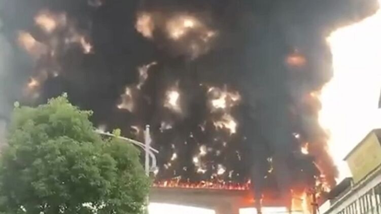 На кадрах видно, как красно-черное пламя вместе с огромными клубами дыма поднимаются до самого неба.
