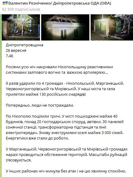 Ночью 26 сентября под обстрелы РФ попала Днепропетровская область.
