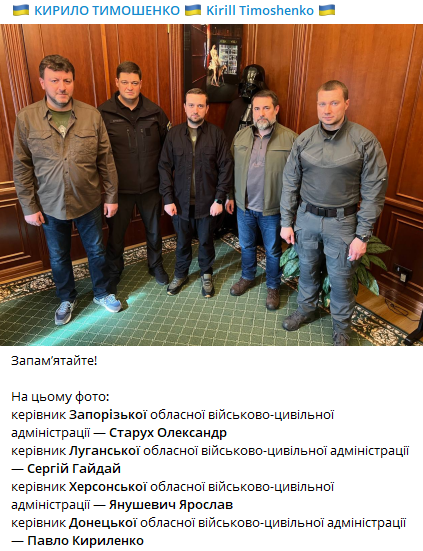 "Запомните! На этом фото: руководитель Запорожской областной военно-гражданской администрации - Старух Александр, руководитель Луганской областной военно-гражданской администрации - Сергей Гайдай, руководитель Херсонской областной военно-гражданской администрации - Янушевич Ярослав, руководитель Донецкой областной военно-гражданской администрации - Павел Кириленко", - подписал он фото.
