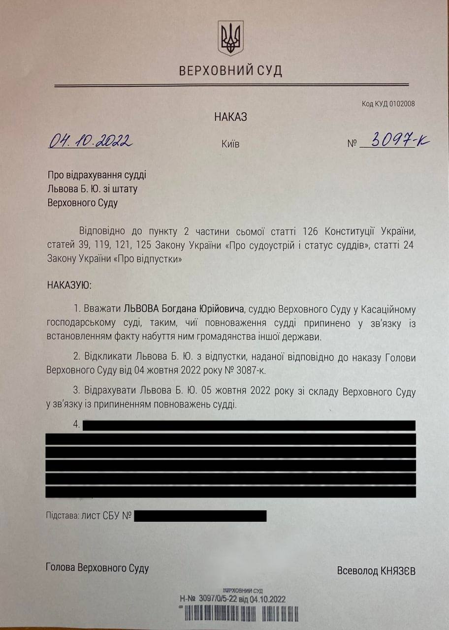 Затем судья Верховного суда Елена Кибенко опубликовала обращение про созыв собрания судей для досрочного прекращения полномочий Львова в связи с информацией о том, что у него есть российский паспорт и незадекларированная квартира в Москве.