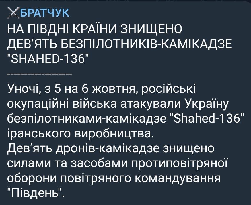 Ночью враг в очередной раз атаковал беспилотниками-камикадзе "Шахид". Девять дронов уничтожены силами и средствами ПВО командования "Юг", из них семь в Николаевской области.