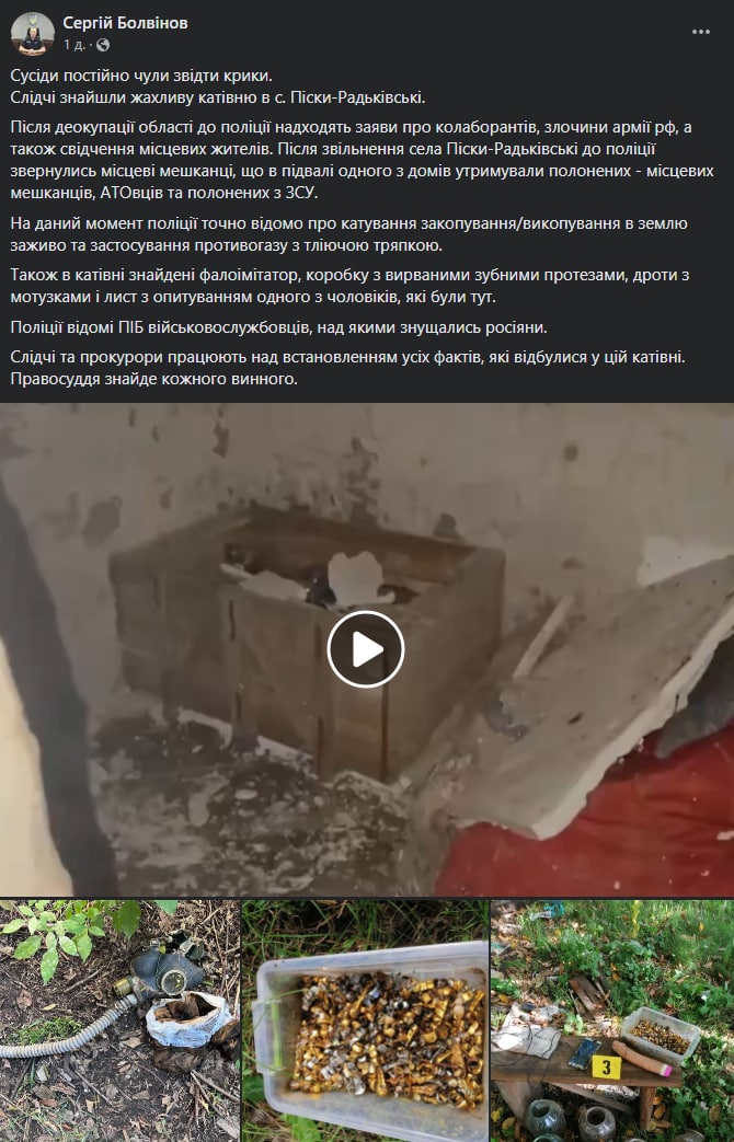 Вчера начальник следственного управления полиции Харьковской области Сергей Болвинов сообщил, что в освобожденных Песках-Редьковских нашли пыточную. Там помимо противогаза, веревок и фаллоимитатора, была коробка с десятками зубных протезов.